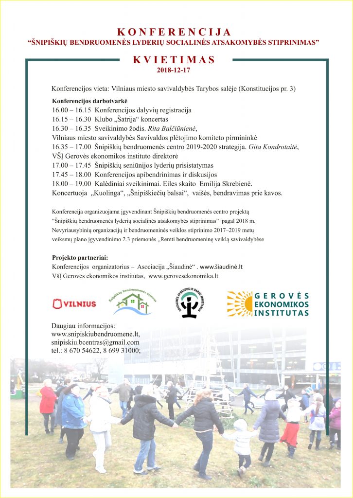 Konferencija organizuojama įgyvendinant Šnipiškių bendruomenės centro projektą “Šnipiškių bendruomenės lyderių socialinės atsakomybės stiprinimas”  pagal 2018 m. Nevyriausybinių organizacijų ir bendruomeninės veiklos stiprinimo 2017–2019 metų veiksmų plano įgyvendinimo 2.3 priemonės „Remti bendruomeninę veiklą savivaldybėse